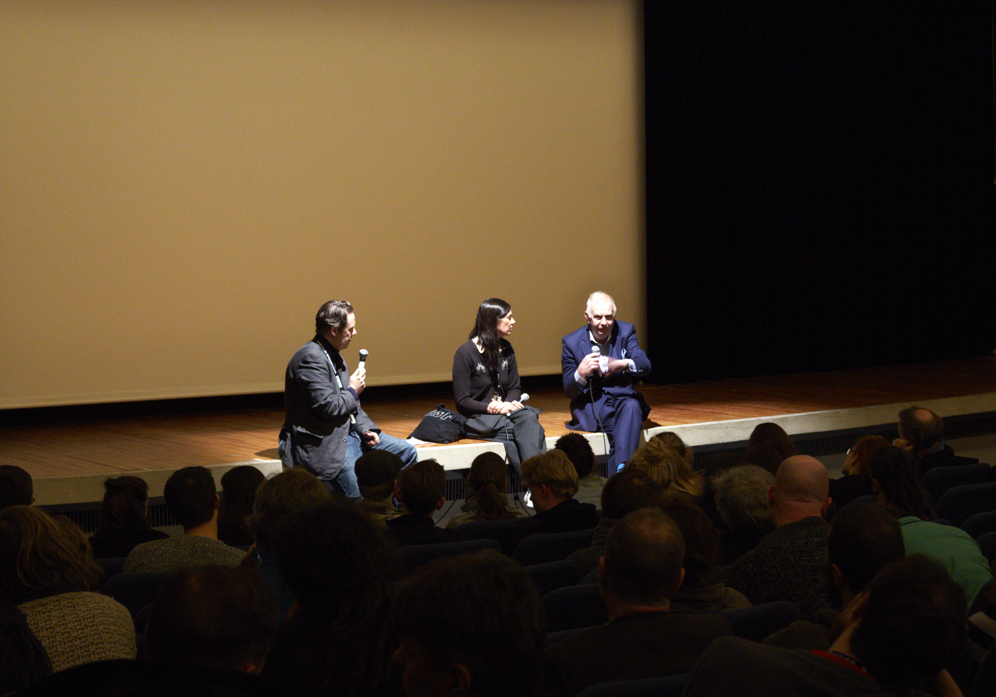 Marcel Schwiering in conversation with Karen Mirza and Klaus vom Bruch (left to right) after the screening of "Cruel Narrations"